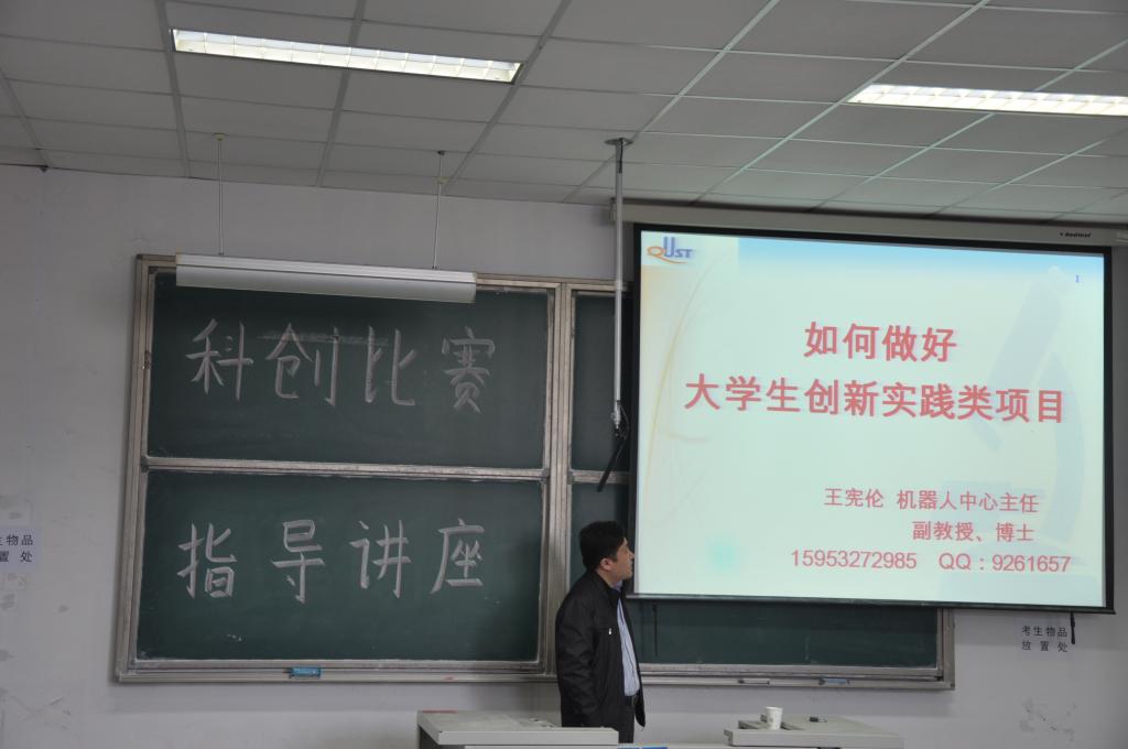 4月21日上午9:00,由ok138太阳集团中国官方网站科技创新协会组织举办的科创比赛指导讲座于弘毅楼E区103教室举行,ok138太阳集团中国官方网站机器人中心主任王宪伦亲临现场指导,讲座吸引了广大科技爱好者积极参加。