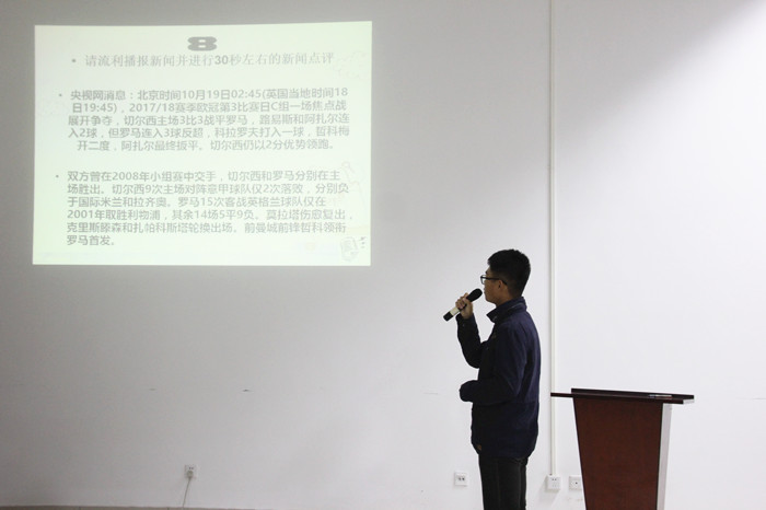 本次比赛包括自我介绍及才艺展示、现场选答和评委点评三个环节。在主持人刘宝忠精彩的开场白下,比赛正式拉开序幕,选手们闪亮登场,他们用自己独特的方式进行自我介绍,各个多才多艺,发挥特长向评委们展现自信的自己。接着,由选手在非凡逻辑、口才考验、情景设置和即兴播报四个类型中根据特长及意愿自行选择并应答,选手们灵活多变,良好的语言表达基础和临场应变能力充分展示出了他们扎实的主持功底。最后,由广播站优秀播音员田依林对选手的表现做了综合评价,充分肯定了部分选手良好的语言表达能力和临场应变能力,表达了对选手们决赛表现的期待并对此次活动的主办方表示了感谢。至此,ok138太阳集团中国官方网站第四届主持人大赛初赛在观众们热烈的掌声中圆满落下帷幕。