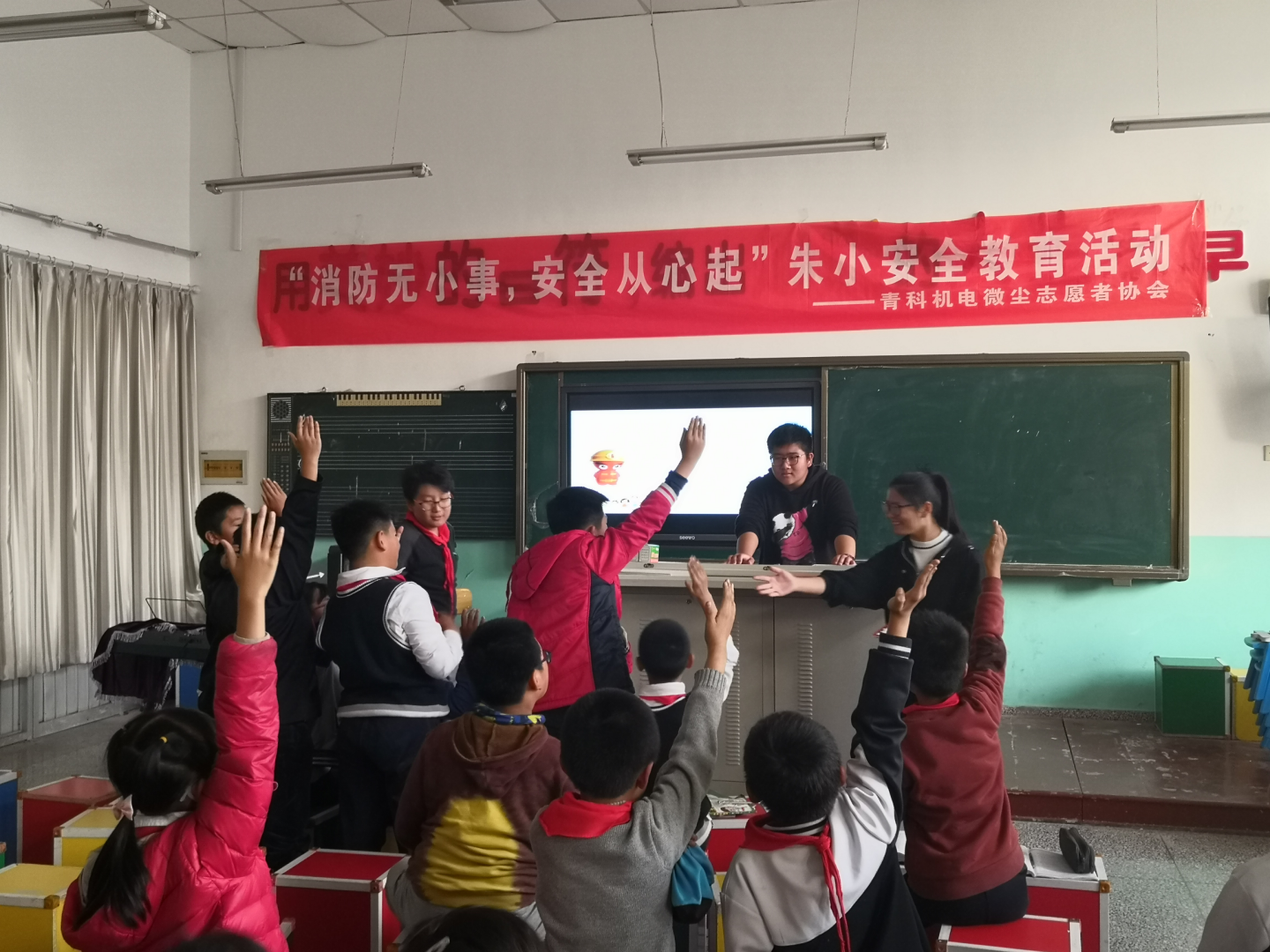 ok138太阳集团中国官方网站微尘志愿者协会于11月13日下午2:00走进朱家洼小学进行了安全教育活动。众所周知,11月9日是全国消防日。所以志愿者们趁此机会给孩子们讲述基本的防火安全常识和防范措施,带着他们认识一些消防设施。并与学生们进行互动交流,大大提高了小学生们的安全防患意识。更吸引人的是有奖问答环节,孩子们踊跃举手发言,与此同时,志愿者们准备了笔和本子等奖品来奖励那些积极发言的孩子。
