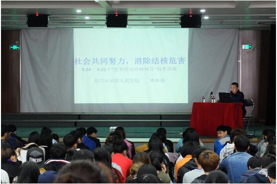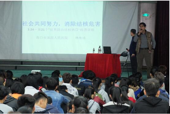 3月24日是第21个“世界防治结核病日”,我校为做好结核病的预防宣传工作,由学生科和校医务室联合组织开展了一次防治结核病教育宣传活动;于3月25日下午2:10在音乐厅举办一场防治结核病专题讲座,讲座由海口市第四人民医院内科主任医师林维靖主讲,听取讲座的有全体学生、班主任、分管学生工作的教研室副主任、医务室人员、学生科相关负责人以及分管学生工作的校领导。