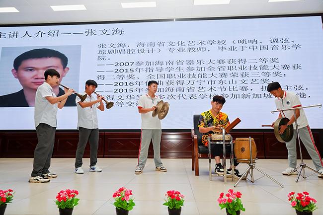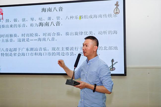 在中国乐器讲座课堂上,悠扬的旋律此起彼伏,我校器乐教研室的学生们用古筝、中阮、二胡、唢呐、笛子等民族乐器为当地师生带来了多首经典曲目并深入讲解了民族音乐作品创作、配器手法及海南八音演奏等知识。