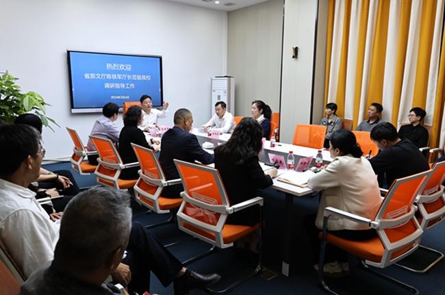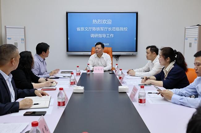 3月6日,省旅文厅党组书记、厅长陈铁军,人事处处长李恩、艺术处处长孙瑜辰、办公室副主任方才立一行莅临我校调研指导工作,我校党总支书记、校长莫青桥,副校长汪红、王枢,各科室主要负责人等陪同调研。