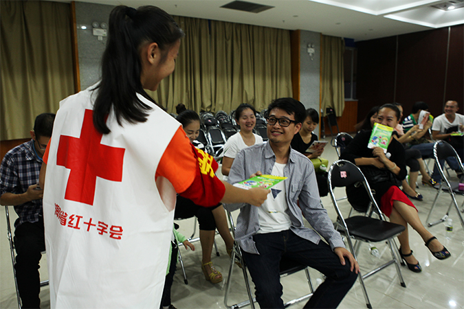 学生会干部给学生们颁发艾滋病宣传礼品(由省红十会提供)