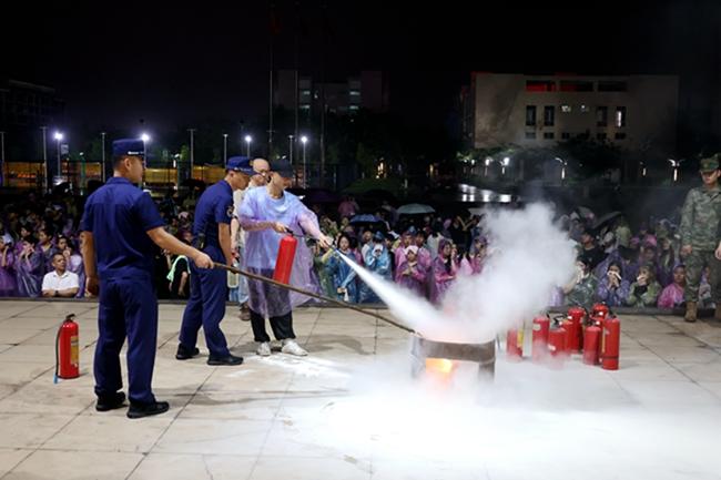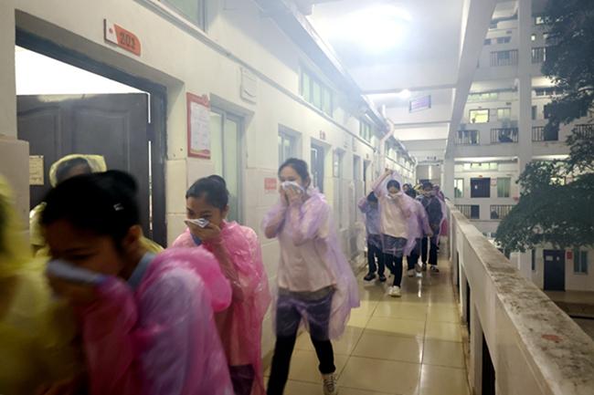 本次演练包含五项内容,一是值班人员火情报警联动处置模拟演练;二是夜间宿舍火情安全疏散演练;三是学生在校情况摸排并模拟突发处置时学生人数清点;四是灭火器、防毒面具的使用学习;五是火警发生后,自救逃生方法注意事项介绍。
