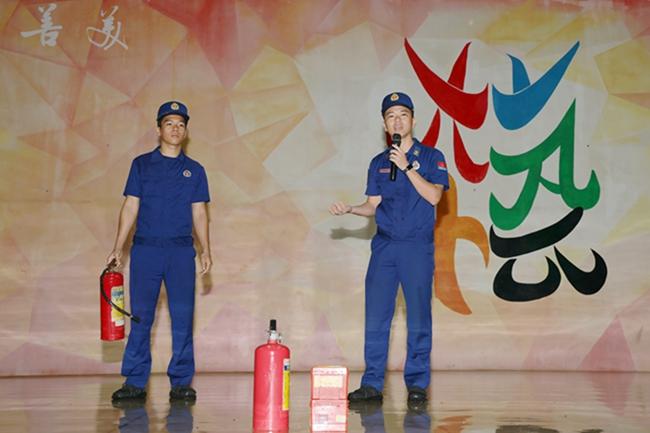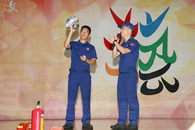 随后,由桂林洋消防救援站队员作消防知识培训。他介绍了火灾现场的自救和逃生要诀,以及干粉灭火器和防毒面具的使用方法。现场学生认真聆听,牢记消防知识,并踊跃报名参与灭火器灭火演示。