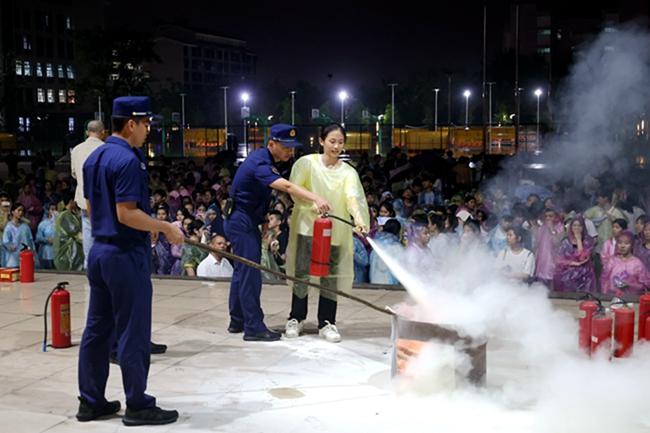 学生积极参与灭火器灭火演示