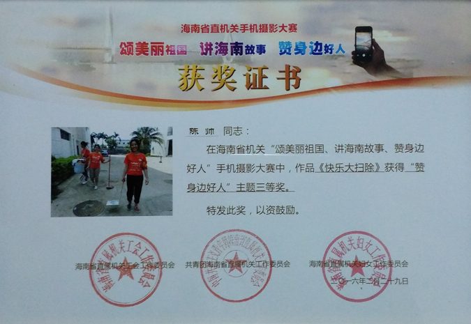 2016年2月,海南省直属机关工会工作委员会组织了一项关于“颂美丽的祖国、讲海南故事、赞身边好人”的手机摄影大赛活动,在省文体厅团委的指导下,我校团支部积极响应,组织作品进行参赛。作品经过层层选拔后,最终我校陈帅老师的作品《快乐大扫除》荣获了“赞身边好人”主题三等奖。