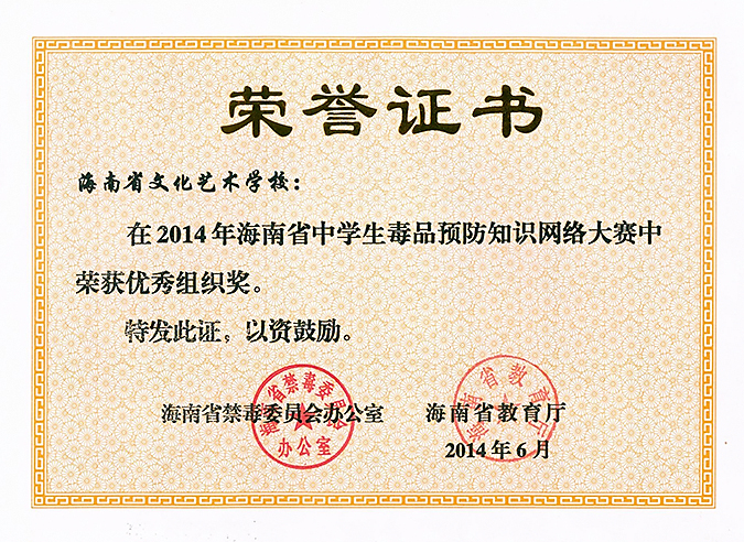 喜讯:我校荣获2014年海南省中学生毒品预防知识网络大赛“优秀组织奖”