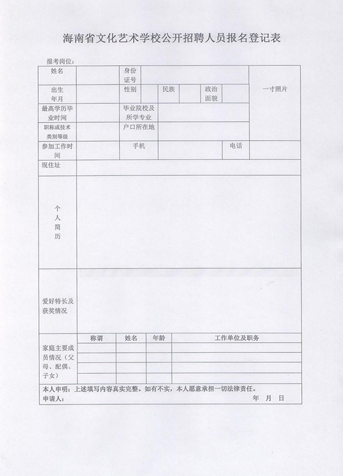 报名者必须如实填写《海南省文化艺术学校公开招聘人员报名登记表》(表格可从学校网站内下载打印填写)并以电子版形式发送到学校办公室邮箱(hnswyx1960@163.com),由学校办公室确认回复报名成功信息视为获得报名资格。
