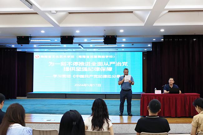 近日,中共中央办公厅印发《关于在全党开展党纪学习教育的通知》,明确自2024年4月至7月在全党开展党纪学习教育。为贯彻落实省委省政府及省旅文厅关于党纪学习教育工作的相关部署,进一步提高全体教职工的遵纪守法意识,5月17日,我校在校音乐厅举办了学习贯彻《中国共产党纪律处分条例》专家讲座。讲座的主题为“为一刻不停推进全面从严治党提供坚强纪律保障”,海南大学马克思主义学院教授、法学博士、博士生导师涂刚鹏应邀主讲。我校党总支书记、校长莫青桥,党总支副书记、副校长汪红,党总支纪检委员、副校长王枢出席,全体教职工参加。讲座由王枢副校长主持。