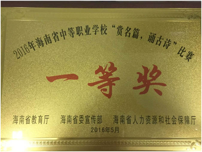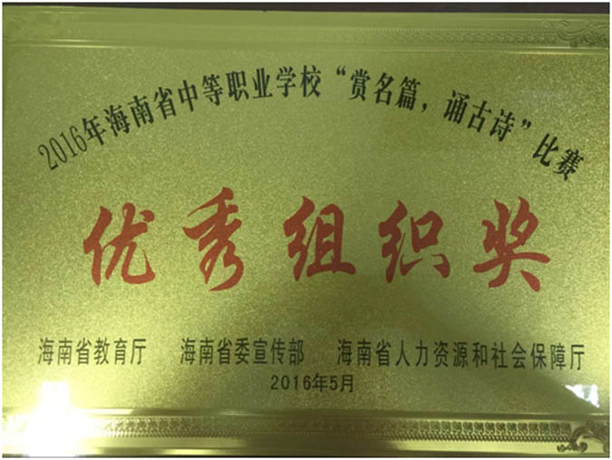 5月26日上午,由省教育厅主办的2016年“赏名篇.诵古诗“比赛在海南职业技术学院拉开了序幕,在汪红副校长的带领以及学生科、校团委、班主任的全力配合下,我校共有55名师生参加比赛,在24支队伍中脱颖而出,最终荣获省属”一等奖“、”优秀组织奖“等荣誉称号。
