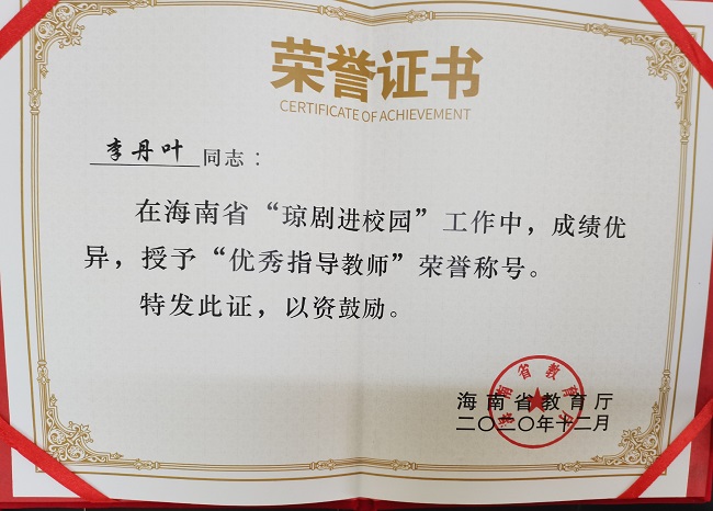 琼剧教研室李丹叶荣获“优秀指导教师”称号