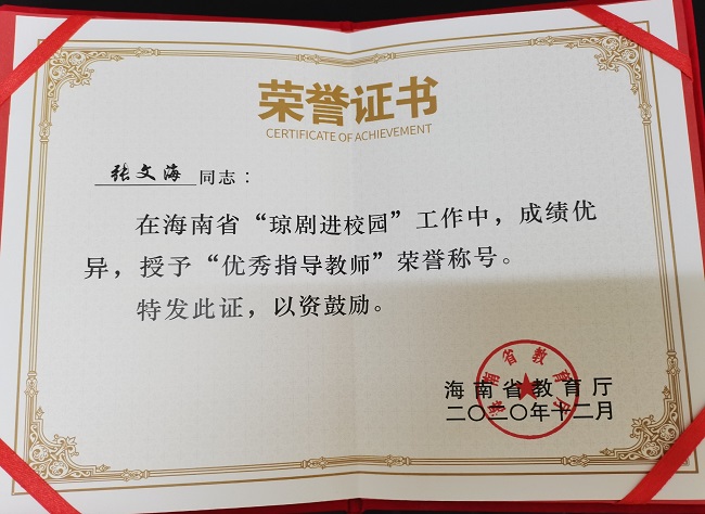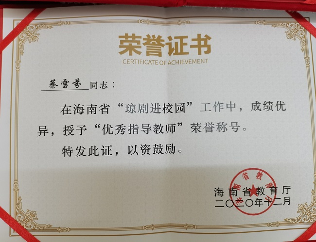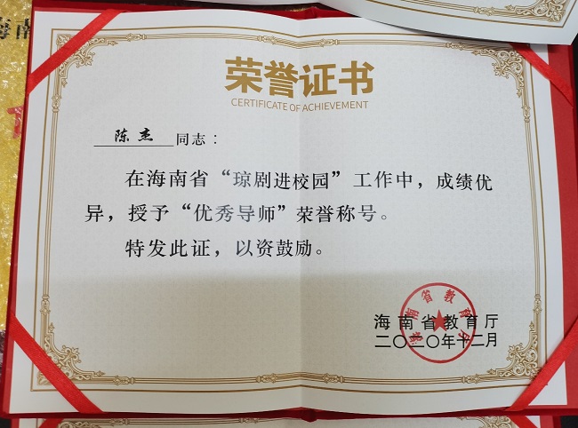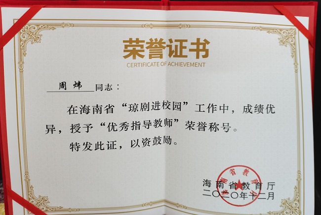 戏台上响起一串急促的鼓点声,几张挂了油彩的脸踱着方步登场,一招一式咿咿呀呀唱尽天上凡间事,惹得台下一张张脸凝神上望……为有效开展“琼剧进校园活动”,自2018年始,我校在省厅号召下持续开展“琼剧进校园”工作,成效显著,在2020年12月刚刚结束的海南省“琼剧进校园”工作评选活动中,我校琼剧教研室、器乐教研室荣获“优秀传承单位”光荣称号,教师李丹叶、张霞云、蔡雪芬、张文海、周炜荣获“优秀指导教师”称号,教师陈杰荣获“优秀导师”称号。