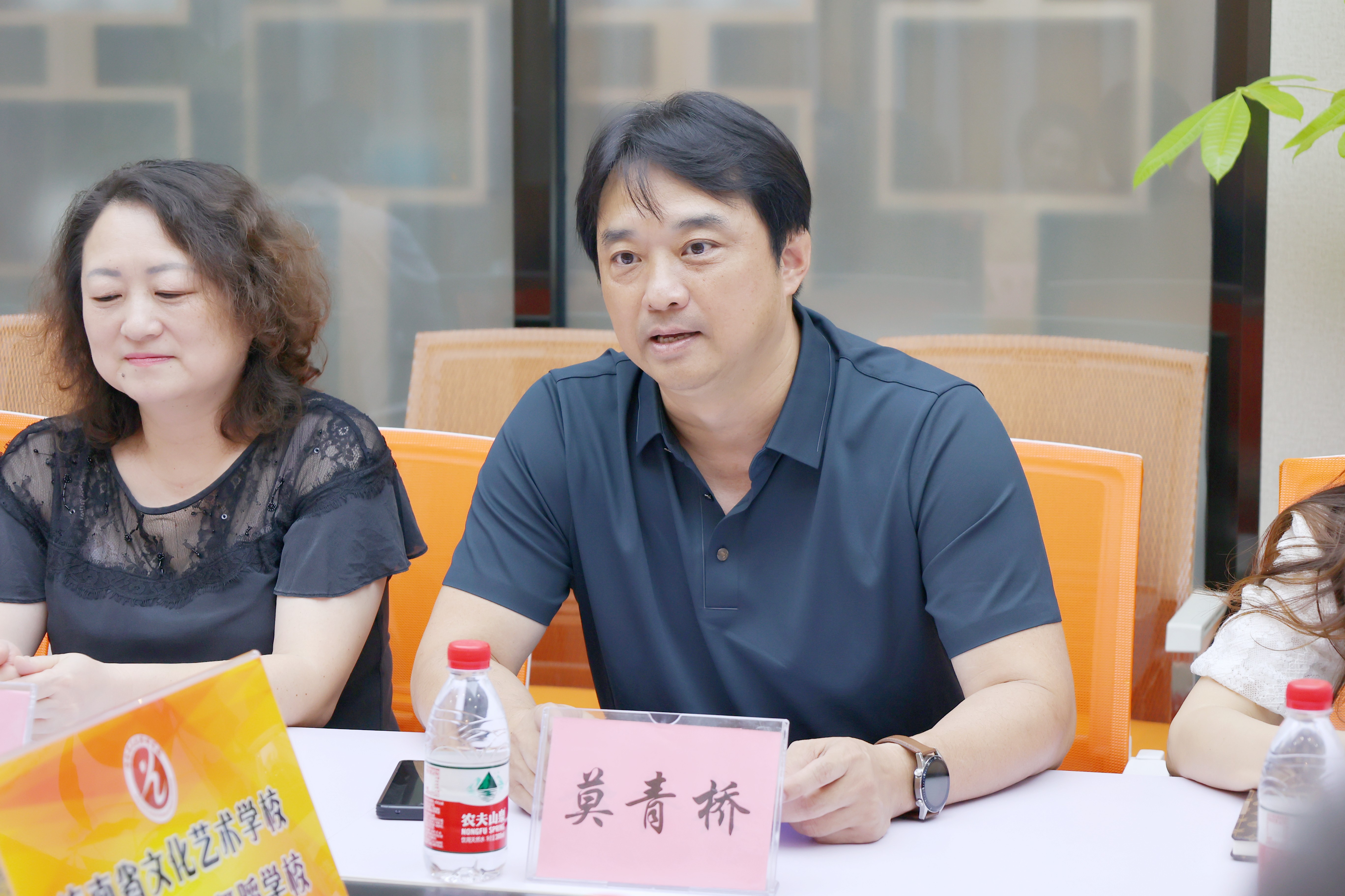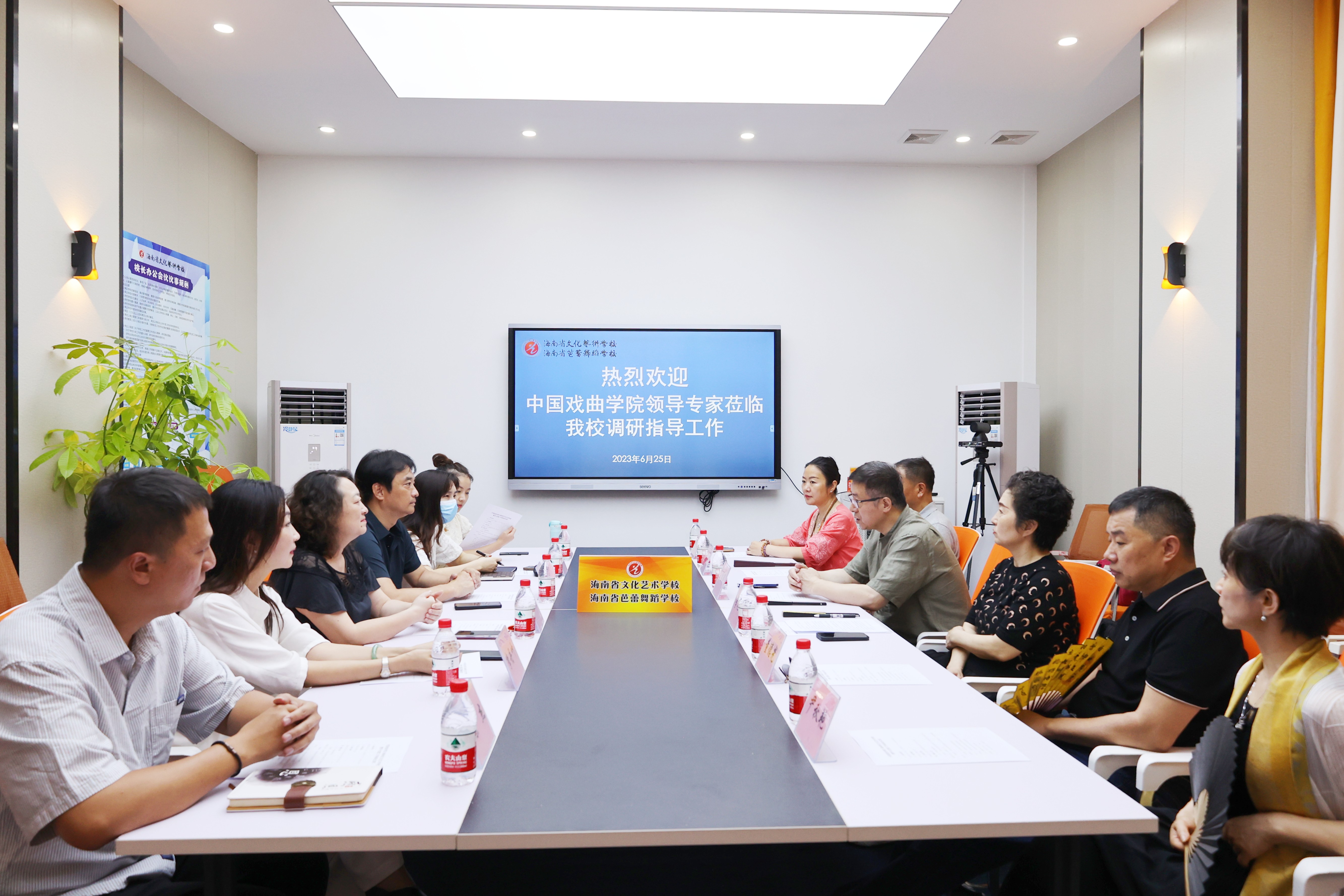 会议开始,双方领导首先相互介绍了各自参会人员以及学校戏曲教学的基本情况。莫青桥校长对王绍军主任一行的到访表示热烈欢迎,对中国戏曲学院长期以来给予的我校发展的支持表示感谢。他表示,海南琼剧作为国家级非物质文化遗产之一,同时也是海南四张旅游文化名片中最具代表性的一张。我校作为海南省唯一一所琼剧教育专业学校,肩负着培养造就琼剧艺术人才的职责使命,能够跟中国戏曲学院合作对琼剧的发展和建设具有重要意义。希望双方立足新时代戏曲人才培养需求,通过探索多种形式和途径,在专业建设、师资提升、教学实践等方面加强交流合作,推进两校之间教育力量的凝聚,助力海南提高戏曲人才培养水平。