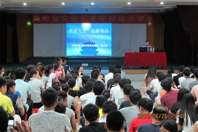 根据省教育厅(琼教体[2015]51号)文件的通知要求,为进一步强化我校师生对毒品危害的认识,在“6·26国际禁毒日”当天下午3:30,按照我校制定的禁毒宣传活动内容之一,由学生科负责聘请“海南省琼山强制隔离戒毒所”政治处的何宝根警官到我校做“2015年禁毒宣传知识讲座”;听取讲座的有全体学生、班主任、分管学生工作的教研室副主任、学生科负责人以及分管学生工作的校领导。