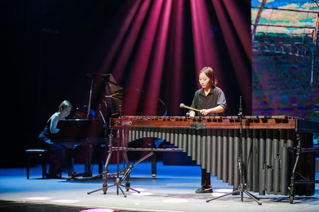 本次演出主题为“盛世中华 砥砺奋进”,以一曲民族管弦乐合奏《我的祖国》拉开序幕,铿锵有力的演奏迅速调动起了现场观众的情绪。活动中,演奏人员通过演奏打击乐合奏《动鼓情》、笛子独奏《牧民新歌》、钢琴独奏《皮黄》、二胡独奏《翻身歌》、大提琴独奏《巴赫第一首》、笙独奏《秦王破阵乐》等多种乐器表演形式,使乐曲在实训剧场久久响彻,将现场气氛推向了高潮。台上的演奏者们以高超的演奏技巧、默契的配合,以及对作品的完美诠释,让现场观众感受到器乐演奏的艺术魅力。