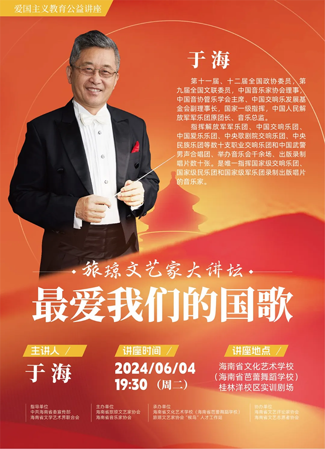 6月4日,旅琼文艺家大讲坛——于海《最爱我们的国歌》专题讲座在海南省文化艺术学校(海南省芭蕾舞蹈学校)开讲。
